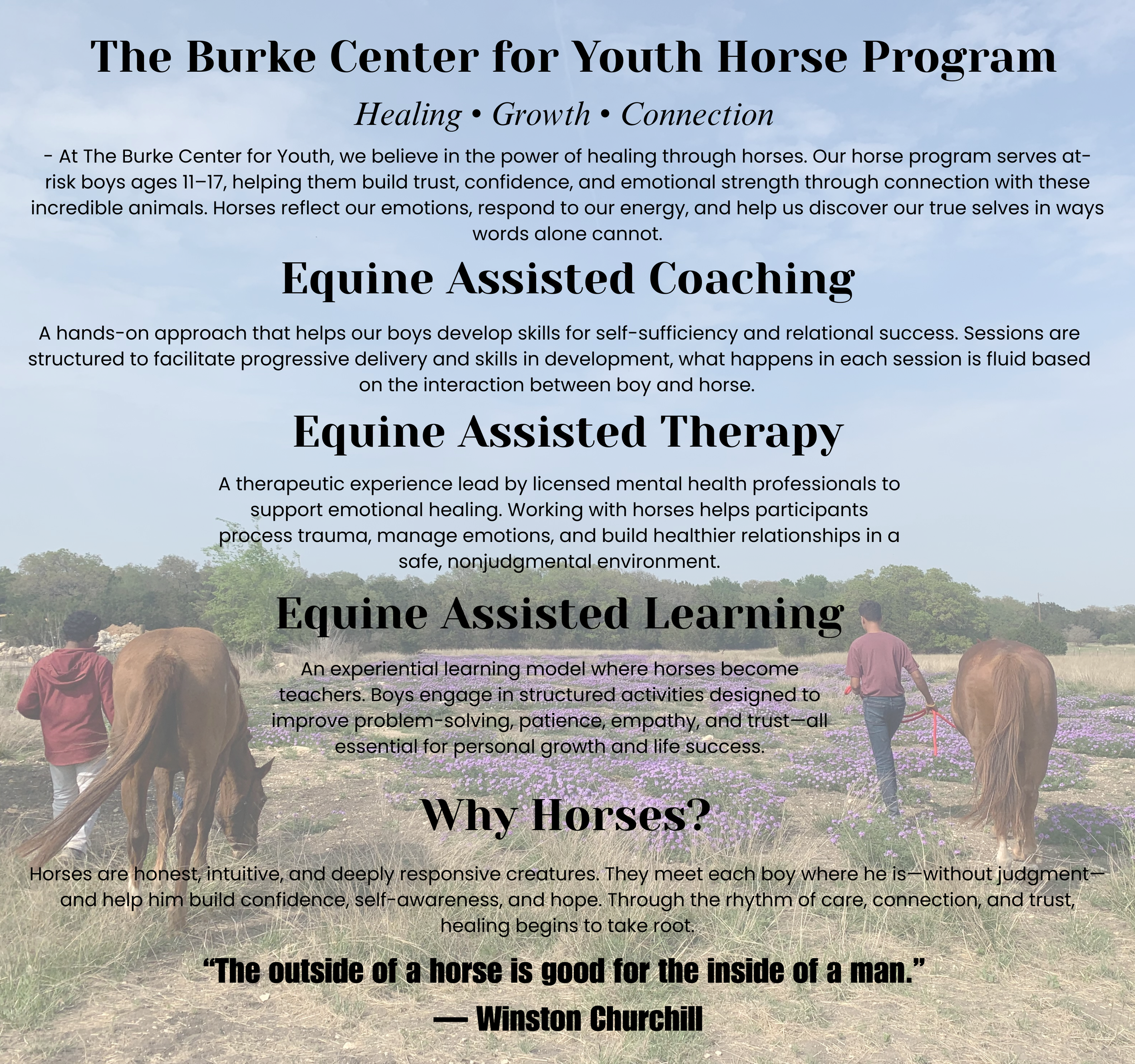 This cause is deeply close to my heart. Alongside my work as a trainer, I manage the equine program at the Burke Center for Youth, a residential treatment center for boys in Driftwood, Texas.